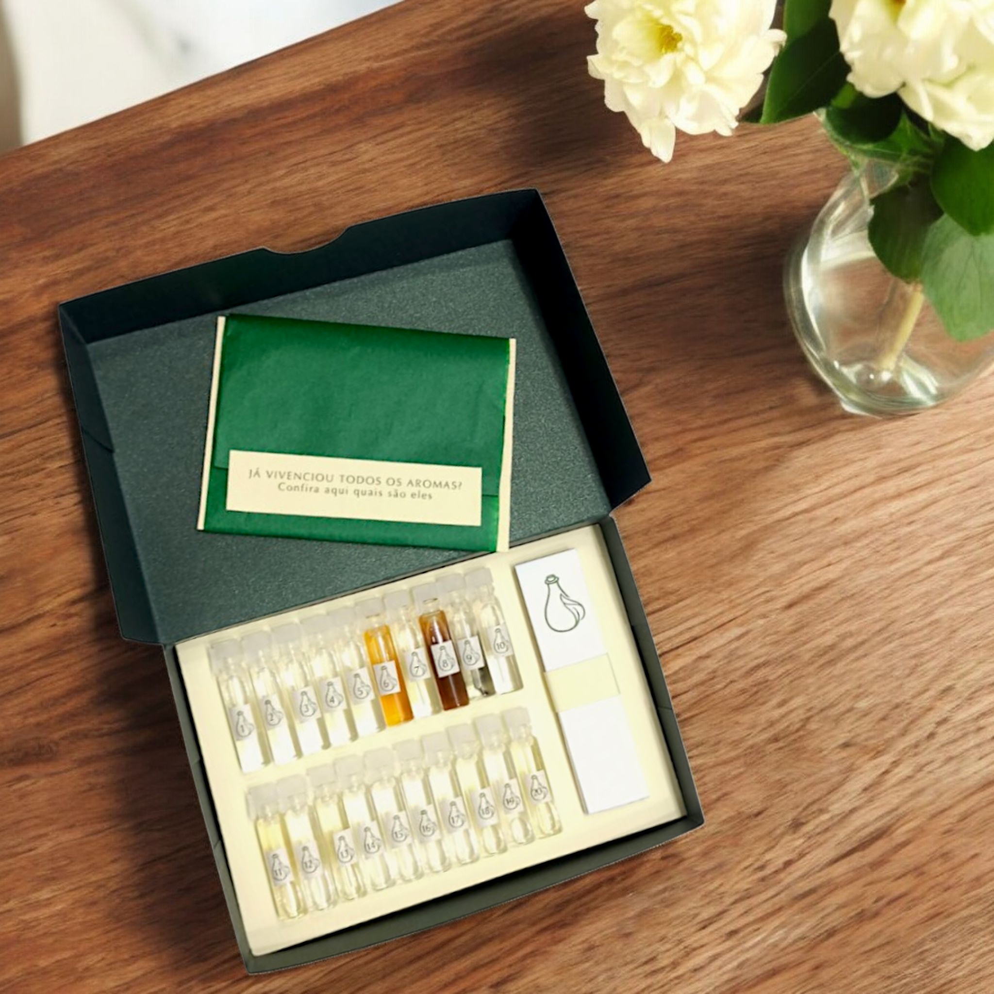 Cada aroma isolado vem pronto para ser explorado, testado e sentido, acompanhado de fitas olfativas para que você possa registrar suas impressões e estudar cada planta como quem escuta uma história.